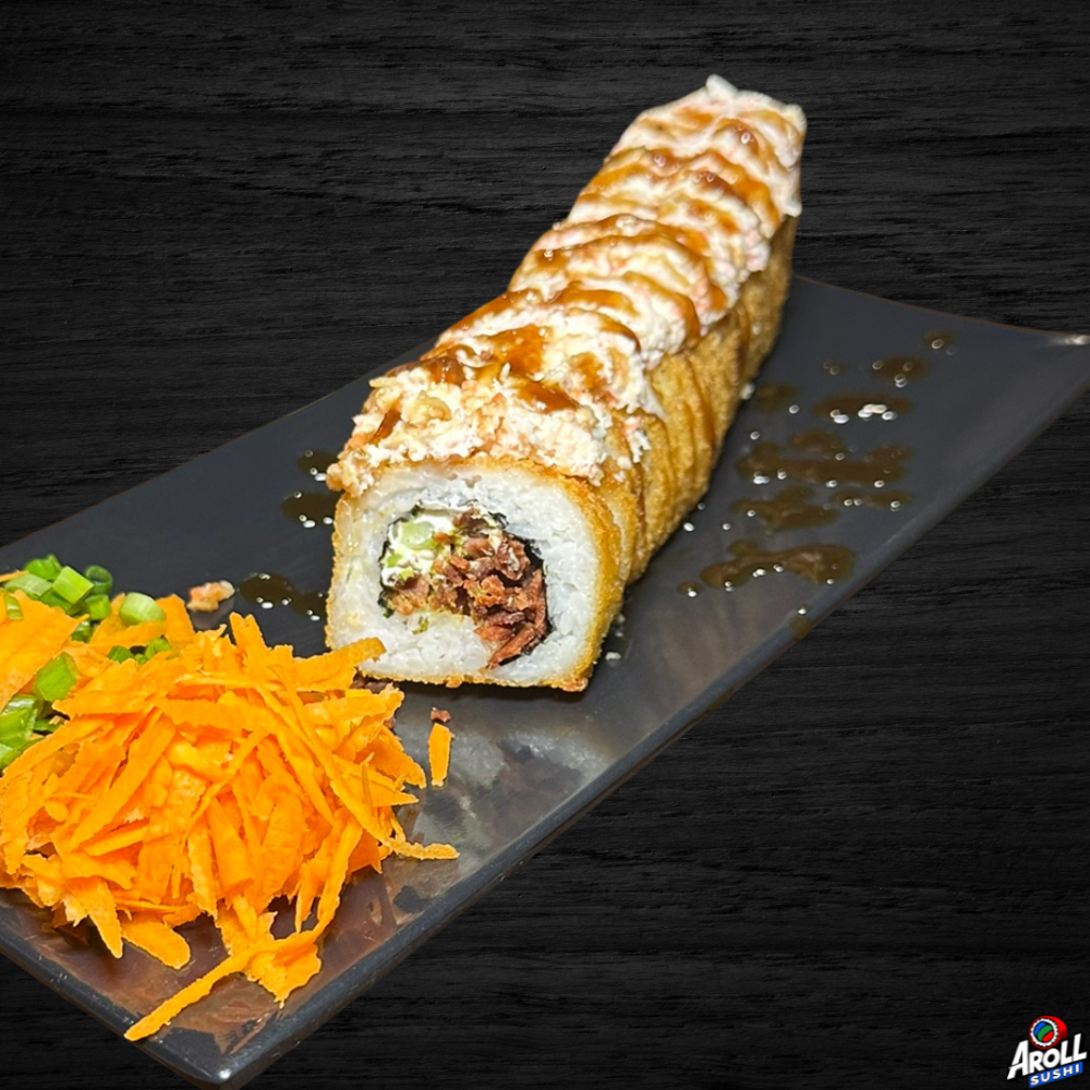 🍣 Relleno brutal: Surimi Empanizado, Pollo, Res, Tocino, Philadelphia, Pepino y Aguacate.🧀 Topping poderoso: Extra gratinado con serrano y tocino, coronado con tampico.